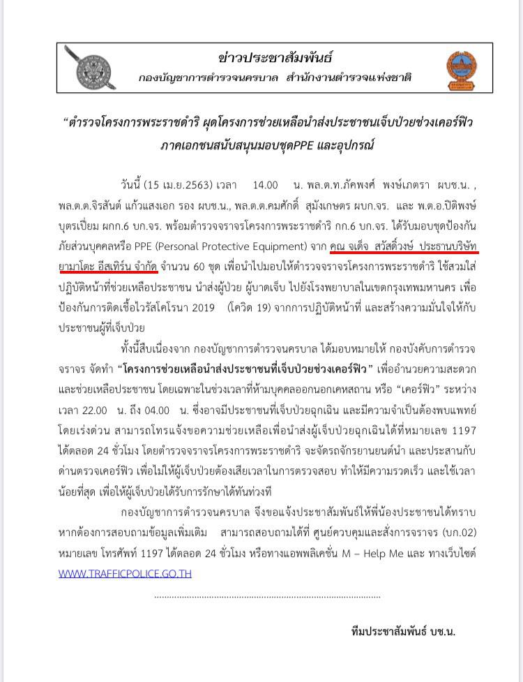 บริษัทยามาโตะ อีสเทิร์นร่วมกับธนาคารกรุงไทย สนับสนุนมอบชุด PPE และอุปกรณ์ให้กับตำรวจจราจรโครงการพระราชดำริ เพื่อใช้สวมใส่ปฏิบัติหน้าที่ช่วยเหลือประชาชนนำส่งผู้ป่วย และผู้บาดเจ็บไปโรงพยาบาลในกรุงเทพมหานคร เพื่อป้องกันการติดเชื้อไวรัสโคโรน่า 2019 (Covid-19)